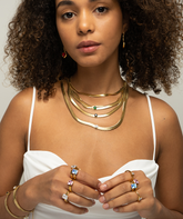 Realizado en acero inoxidable con un elegante chapado en oro de 18k, este anillo está diseñado para mantener su brillo impecable con el paso del tiempo, incluso si lo llevas cada día.