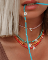 Collar Inicial Gala, realizado en piedra natural e inicial de nacar con detalles en acero inoxidable con baño de oro de 18k, selecciona tu color favorito, a continuación indica la inicial en el recuadro.