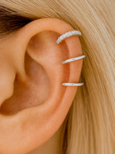 Plata de Ley 925 con acabado en brillo y circonitas engarzadas que hará que se mantengan como el primer día aunque no te lo quites nunca. Diseño exclusivo y minimalista que hará que parezca que llevas tres aros sin necesidad de agujero.
