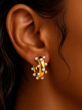 Pendientes Aro Marilyn, realizados en Acero Inoxidable chapados en oro de 18k y circonitas y perlas engarzadas, el diámetro total del aro es 2cm.